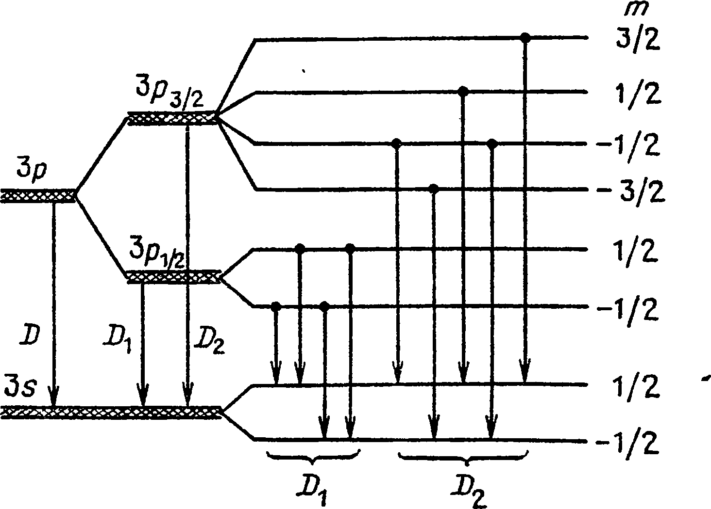 Теперь все встало на свои места: с учетом спина электрона уровень 35 в атоме натрия останется без изменения, так как соответствует моменту / = 0, но уровень Зр с моментом /=1 расщепится на два: 3pi/2 и Зрз/2, энергии которых немного различны. (Значения / = /-|-5 и j = 1– 5 условились писать справа внизу у символа терма, поэтому 3pi/2 соответствует полному моменту / = 1/2, а Зрз/2 – моменту / = 3/2.) В соответствии с этим вместо одной D-линии натрия мы увидим две тесно расположенные спектральные линии, причем линия Di соответствует переходу 3pi/2 З51/2, а линия D2 —