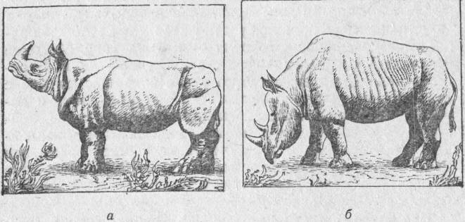 Рис. 34. Индийский носорог (а); суматринский носорог (б)