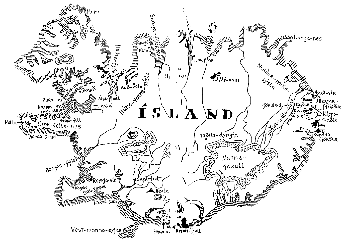КАРТА ИСЛАНДИИ С УКАЗАТЕЛЕМ МЕСТ, УПОМЯНУТЫХ В РАССКАЗАХ