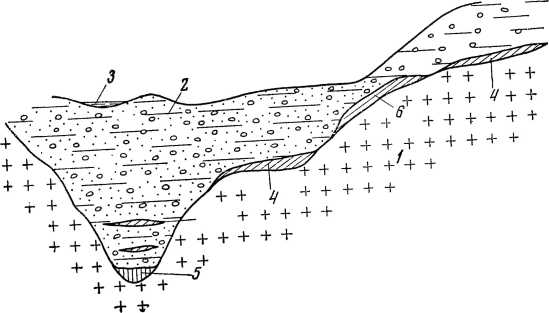 Строение золотоносной россыпи: 1 – коренные породы: 2 – аллювиальные отложения; 3 – современное русло; 4 – террасовые россыпи; 5 – доледниковая россыпь; 6 – увальная россыпь; 7 – пропластки.