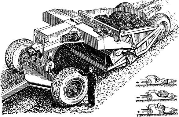Работа тракторного скрепера состоит в опускании ковша и врезании его в грунт, наполнении ковша, транспортировке грунта и разгрузке ковша. Управление рабочими механизмами скрепера бывает гидравлическим и канатным.