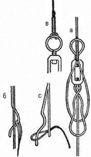 Рис. 44. Различные виды карабинчиков и способы их соединения с леской
