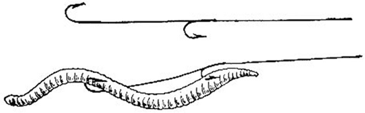 Черви для насадки выбираются, смотря по местности. Иногда форель лучше берет на мелкого червя, иногда на крупного, но вообще следует заметить, что по глухим речкам лучше ловить на обыкновенного земляного червя, живущего тут же, в берегах, и хорошо знакомого рыбе, которая здесь вовсе не знает красного навозного, а тем более большого червя (глист, глистовка, выползок, бертыль, росовой, дождевой червь), который водится преимущественно в садах и огородах. Есть местности, где никакая рыба почти не берет на выползка. Насаживается червь на крючки соответственной величины, крупные на № 0 или 1–2, а простые земляные и навозные на 3–6, пониже головы, отпуская длинный хвостик, если форель не объедает червя. В последнем случае удобнее насаживать червя на стюартовскую снасточку из 2–3 небольших крючков. Червь предпочитается очищенный, т. е. лежалый и с пустыми внутренностями, так как такой крепче сидит на крючке и рыба охотнее его берет. В мутной воде, однако, по мнению многих иностранных авторов, лучше насаживать свежего, неочищенного и более вонючего червя, потому будто, что форель дальше его чует. Обоняние у рыб вообще гораздо сильнее развито, чем обыкновенно думают.