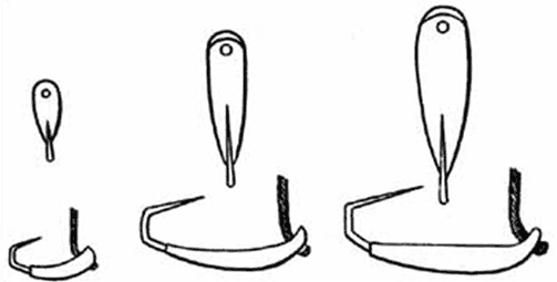 Лучшей из оловянных блесен, на основании личного опыта, я признаю сердобскую, имеющую выгиб, а в разрезе форму равнобедренного треугольника с очень тупым углом в вершине и двойным крючком (в хвосте). Московская блесна – трехгранный кусок олова с одним крючком в голове – слишком тяжела и пригодна только для осеннего блеснения, так же как, по всей вероятности, новгородская – плоский овальный кусок олова (а иногда и свинца) с одним крючком.