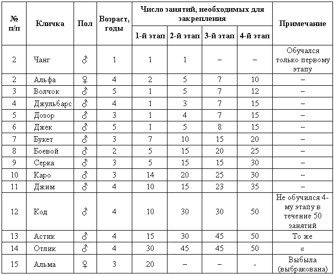 Ясно видна огромная изменчивость в быстроте выработки данного условно-рефлекторного навыка. Возможно предположение, что она зависит от различия в технике обучения отдельных собак. Однако, как уже указано выше, все эти собаки, кроме одной, обучались хотя и различными людьми, но под руководством одного и того же опытного дрессировщика. Ускорить обучение плохо дрессируемых собак не мог и он. Другое предположение, что собаки, предшествующая жизнь которых (кроме одной) нам была неизвестна, уже раньше могли дрессироваться аппортировке, не могло бы объяснить различий, которые наблюдались в обучаемости всем четырем этапам дрессировки. Предшествующим обучением можно объяснить только различие в обучаемости первому этапу. Все же три последующие этапа обучения настолько специальны, что никакой любитель-собаковод не мог обучать этим приемам своих собак. Однако, как видно из табл. 1, имеется четкая зависимость в быстроте обучаемости всем четырем этапам.