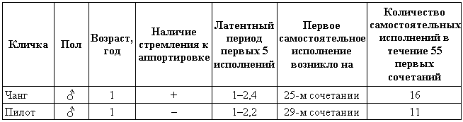 Таблица 2. Быстрота выработки условного рефлекса «садиться» у собаки, обладающей склонностью к аппортировке, по сравнению с собакой, не обладающей этим свойством