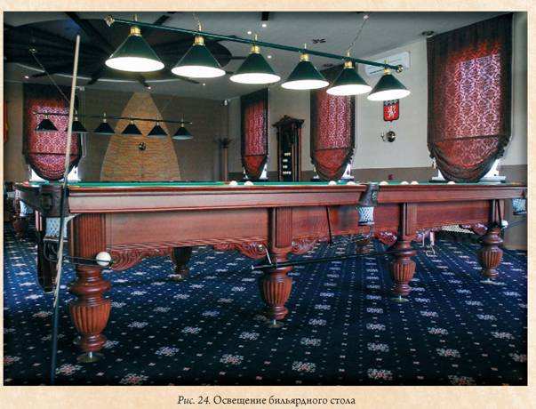 Светильник. Точность удара и результативность игры во многом зависят от того, насколько профессионально выполнено освещение бильярдного стола. Обычные лампы не обеспечивают необходимого эффекта и не защищают зрение спортсменов. Над бильярдным столом должен висеть специальный светильник, который дает рассеянный свет по всей поверхности игрового поля, чтобы шары не отбрасывали длинных и резких теней. Кроме того, светильник должен находиться на определенной высоте, чтобы он не мешал игре и свет не попадал игрокам в глаза.
