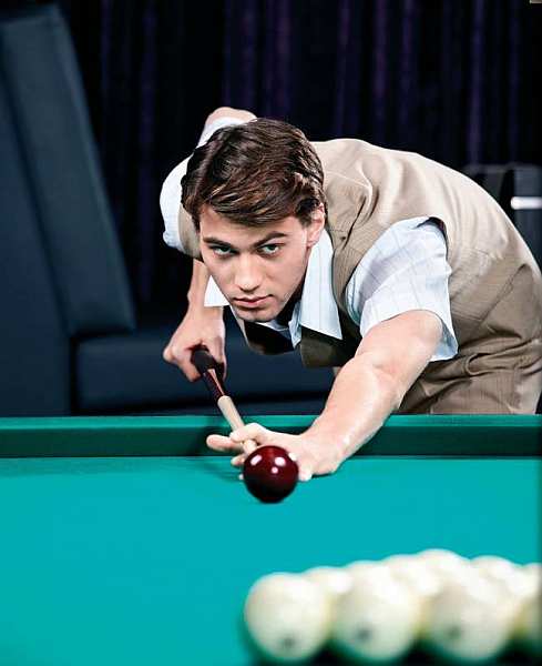 Один из важнейших моментов при подходе к столу перед нанесением удара по шару – умение правильно расположить ноги. Ваша левая нога всегда должна быть немного впереди правой относительно предполагаемой прямой линии, по которой наносится удар. Носок правой ноги разверните слегка вправо. Левую ногу слегка согните в колене, а правую, наоборот, постарайтесь выгнуть назад. При этом ваше правое бедро, когда вы будете наклоняться для удара, уйдет влево, тем самым освобождая пространство для движения кия. Вес вашего тела должен приходиться на правую ногу, а не на руку, которая лежит на столе. Для того чтобы проверить, правильно ли вы стоите, попробуйте поднять левую руку вверх. Если вам это удастся, значит, центр тяжести размещен верно.