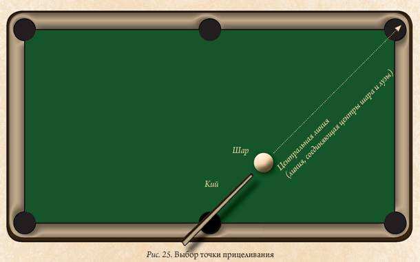 Подготовка к любому удару начинается с выбора точки прицеливания. Для начала будем иметь в виду лишь один шар – биток. Вспомним, что биток – это тот шар, по которому, согласно правилам какой-либо конкретной игры, наносят удары наклейкой кия. Итак, находим точку прицеливания на шаре и мысленно проводим линию, связывающую центр битка с центром лузы, а уже затем подходим к столу и встаем на этой линии. Без выбора точки прицеливания нельзя занимать игровую стойку, ведь центр битка и точка прицеливания определяют направление удара, а следовательно, и исходное положение кия.