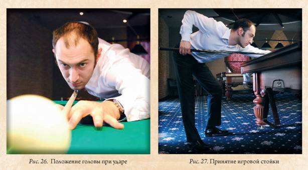 В процессе удара участвует и голова. Когда вы наклонитесь для удара, проследите за тем, чтобы ваша голова располагалась как можно ближе к кию. Это позволит более четко видеть стол и точку прицела. Не ленитесь наклоняться! Следите также и за тем, чтобы ваш подбородок находился строго над кием. Из какого бы положения вы ни наносили удар, не пытайтесь сразу подняться и выпрямиться. В бильярде есть такое понятие, как «фиксация стойки». Когда вы наносите удар, работает только рука от локтя и ниже, а все остальные части тела должны быть неподвижны. Большинство людей во время удара помогают себе корпусом или плечом, но это лишь усложняет задачу, так как кию придаются дополнительные колебания вправо и влево. Чтобы этого избежать, постарайтесь после удара зафиксировать стойку, выждать паузу и только потом поднимайтесь.