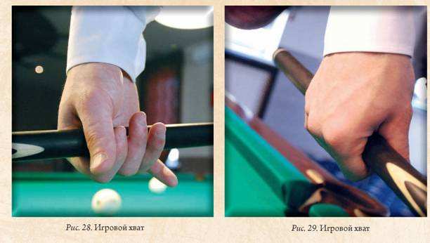 Теперь рассмотрим, как правильно держать кий. Держать кий следует без напряжения, с помощью большого, указательного, среднего и безымянного пальцев правой руки, при этом кий не должен касаться ладони. Важно сохранять легкий хват на протяжении всей игры. Слишком сильное сжатие кия при нанесении удара по битку является распространенной ошибкой, которая не только сказывается на точности, но и не позволяет выполнить целый ряд основополагающих технических приемов.