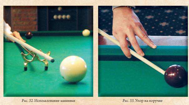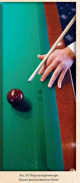 Если необходимо произвести удар по битку через шар, поступите следующим образом. Обоприте все четыре пальца о поверхность стола позади мешающего прицельного шара (или шаров), поднимите кисть на необходимую высоту и разместите кий на упоре, образованном большим пальцем и суставом указательного пальца. Это неудобный упор, однако он необходим в практической игре.