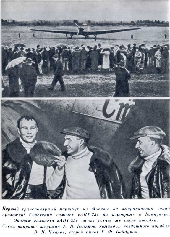 «Находясь над Британской Колумбией (Канада), экипаж принял решение пересечь Скалистые горы и вышел на побережье Тихого океана. Пролетев на юг над территорией США, пилоты совершили посадку близ Портланда, на военном аэродроме Ванкувер, в штате Вашингтон. Советский самолет находился в воздухе шестьдесят три с половиной часа и прошел только над льдами и океанами около шести тысяч километров. Воздушный путь между Европой и США через Северный полюс открыт!»