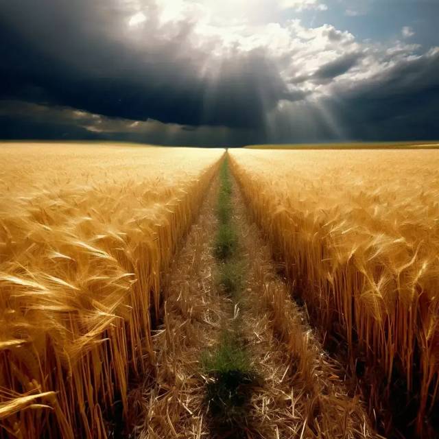 Колоски нервно колышутся под порывами ураганного ветра в лучах полуденного солнца в безмятежно голубом небе.