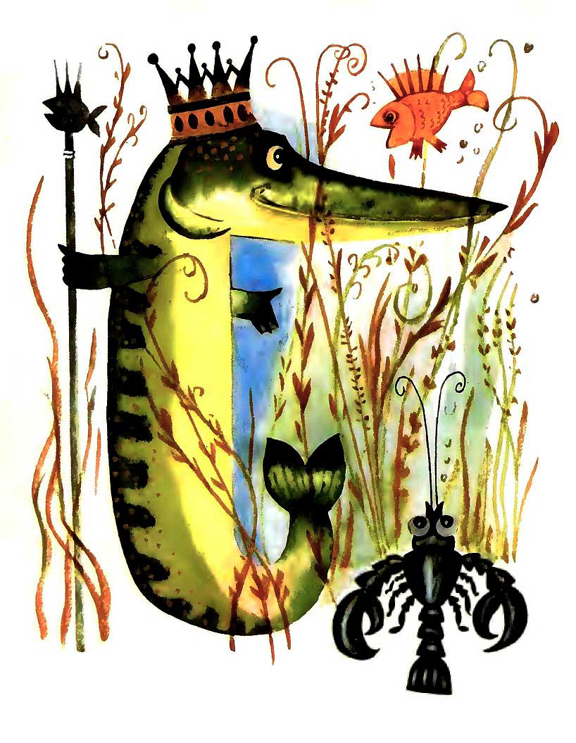 И тут из глубины зелёной выплыла царь-щука. С бревно толщиной. Глазища у неё – с тарелку каждый. Глядит на ерша, не мигает. Разинула щука пасть, показала свои зубы острые в два ряда и говорит: