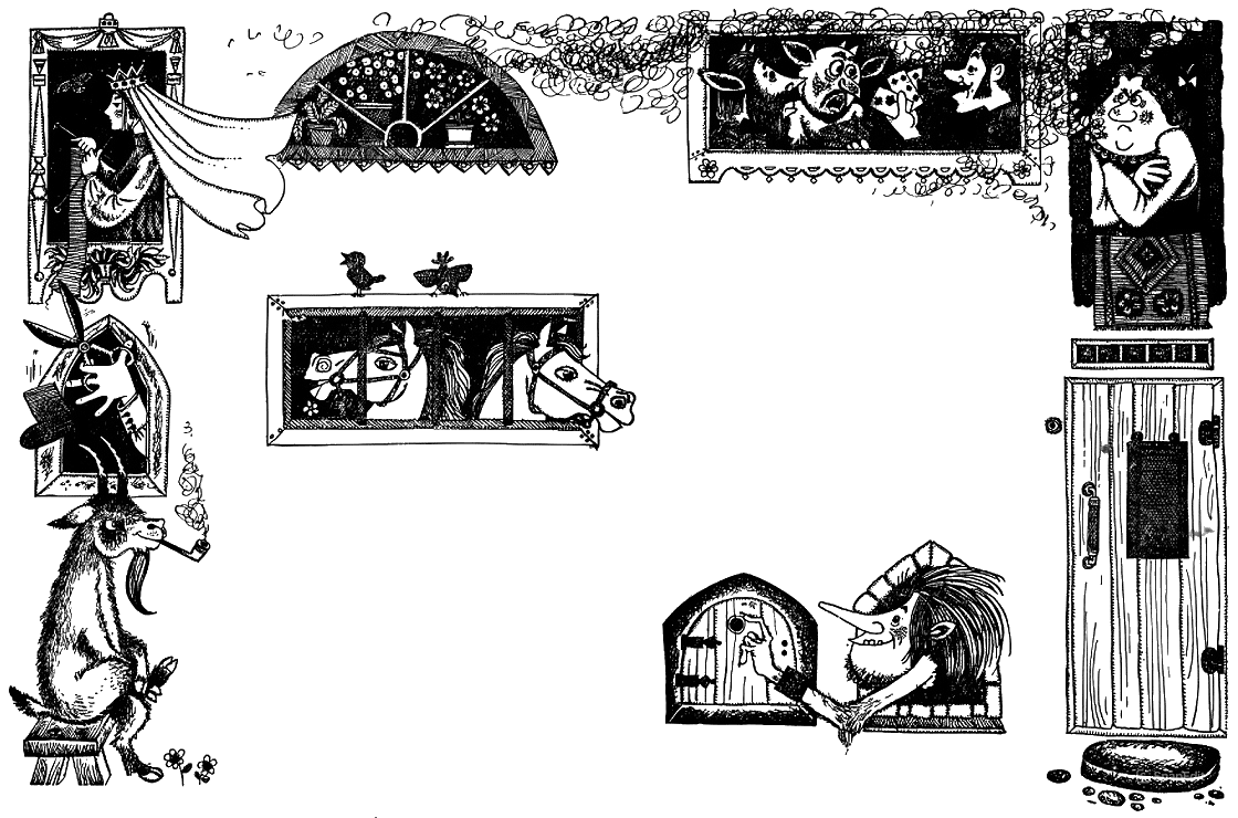 Закачали, замотали головами поросёнок, мартышка, козлёнок, петушишка и собачонка-дворняжка. Просят старичка каждый по-своему. Поросёнок верещит, мартышка визжит, козлёнок бебекает, петушишка кукарекает, а собачонка-дворняжка скулит.