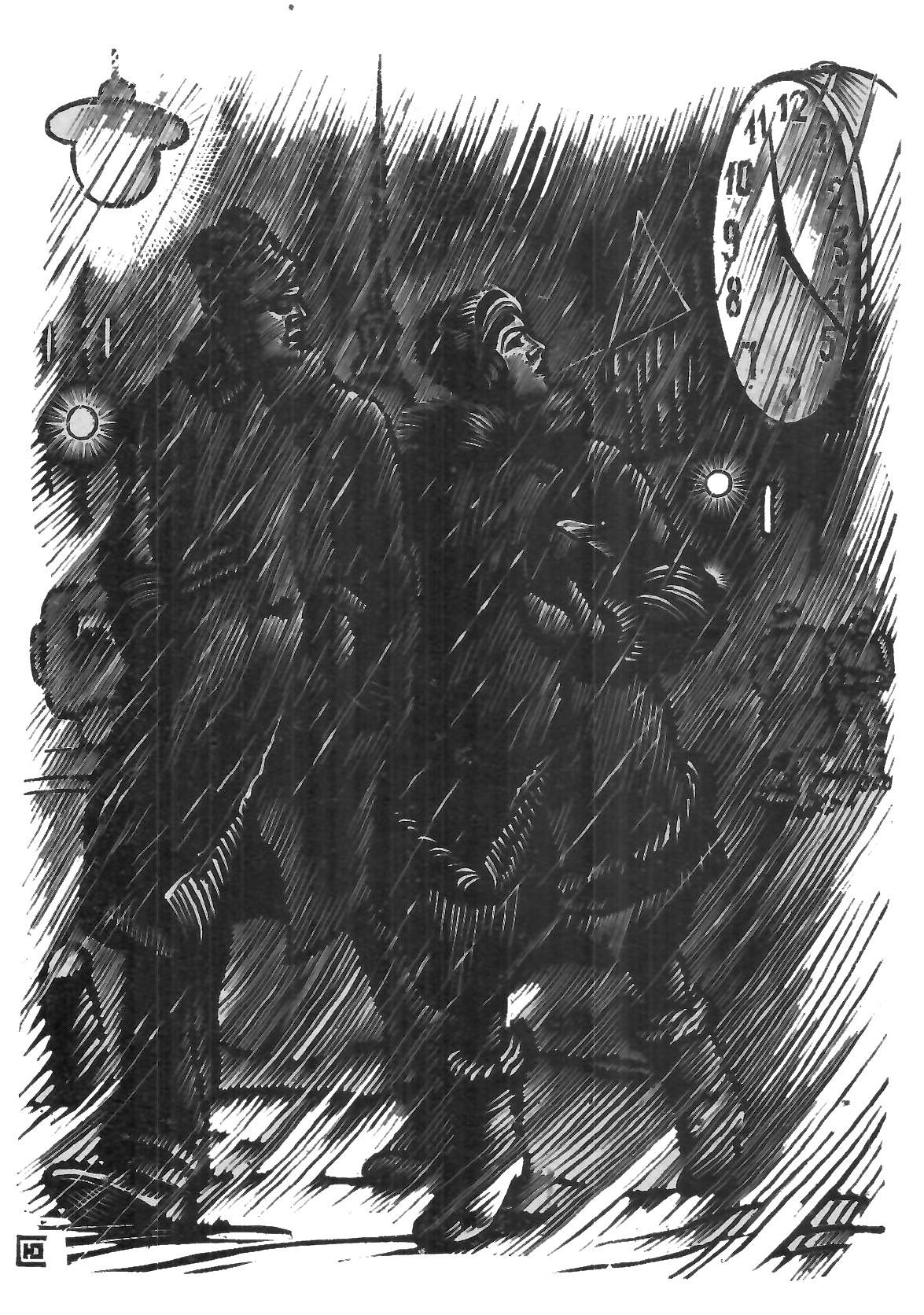 На перекрестке двух людных улиц движение остановило Андрея. В хлопьях снега шли перед ним пешеходы, трамваи, автомобили, автобусы. Светлый диск больших электрических часов висел над перекрестком, как солнце.