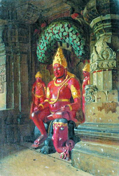 Что же привлекало путешественников в этих пунктах? Эллора – небольшая деревушка вблизи города Аурангабад, северо-восточнее Бомбея. В ее окрестностях художник мог познакомиться с группой древних пещерных храмов VI–X веков, украшенных каменными скульптурами. Особенно интересен здесь храм Кайласантаха, высеченный из каменного монолита. Его поверхность сплошь покрыта фигурами богов и разных фантастических существ, а основание опоясано вереницей слонов, высеченных из камня в натуральную величину.