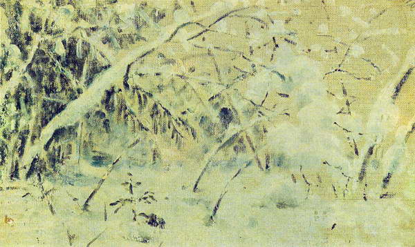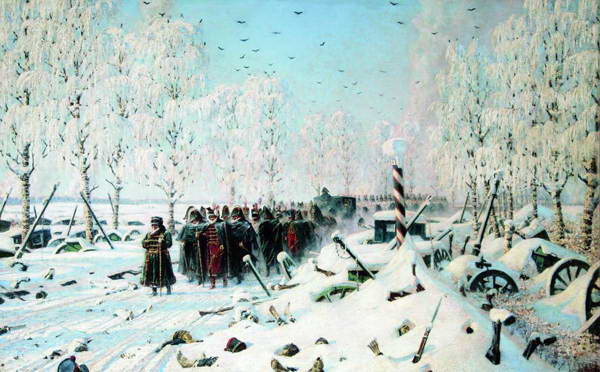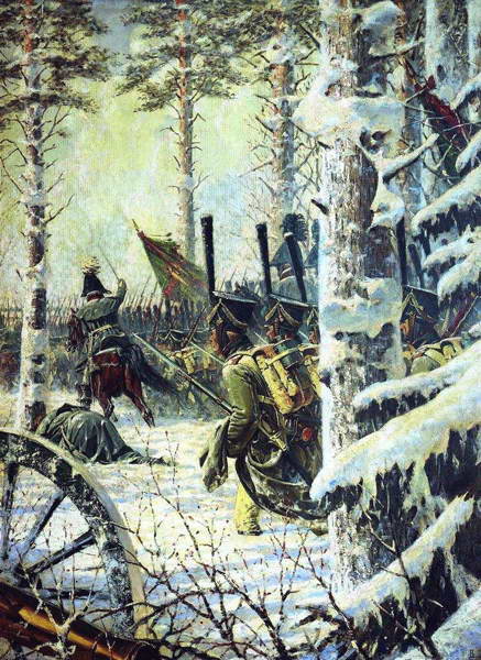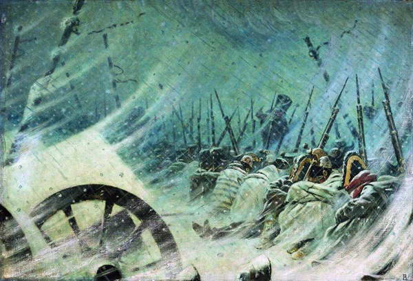 На первой из этих картин мы видим привал наполеоновских солдат, обессиленных, голодных, на снегу в лютую зимнюю стужу. Это уже не армия, а жалкое, деморализованное скопище мародеров, одетых кто во что горазд – награбленные церковные ризы, женские салопы, барские шубы и т. п. Метет снег, солдаты жмутся друг к другу, тщетно пытаясь согреться.