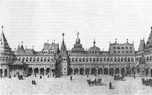 В конце прошлого века в архитектуре крупных городов России стал насаждаться псевдорусский стиль. В большинстве случаев это были малоталантливые, претенциозные подделки под старину, с башенками, всякой лепниной, лишенные четкого архитектурного образа. Вряд ли такие творения могли вызывать восторг у требовательного художника. Наиболее плодотворными он считал поиски нового самобытного русского стиля в архитектуре, в котором бы повторялись наиболее выразительные элементы древнерусских памятников. Верещагин даже выступил с архитектурным проектом торговых рядов в Москве. По своему облику они должны были гармонировать с Кремлем, поскольку художник использовал некоторые внешние мотивы несохранившегося Коломенского дворца. По его замыслу при осуществлении проекта должны были учитываться технические новшества – металлические конструкции, мощные подъемные лифты и другие. Этот проект так и не был осуществлен, но попытка Верещагина выступить и в качестве архитектора примечательна: она раскрывает еще одну грань его творчества.