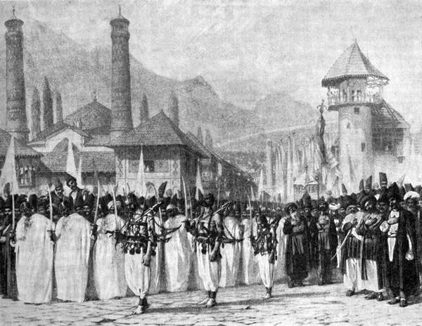 В последний день празднования, когда страсти были накалены до предела, начиналось шествие особых приверженцев культа – самоистязателей, как бы принимавших на себя муки самого почитаемого имама – Гусейна. Эти праздничные обряды, которые увидел Верещагин, отнюдь не были чисто местными, характерными только для Восточного Закавказья. Их можно наблюдать у шиитов Ирана и других стран мусульманского мира. Дальше мы читаем выразительное описание зрелища: «Протяжные крики „Гусейн! Гусейн!“ дали знать о приближении процессии, которая вскоре и показалась. Впереди тихо двигаются режущиеся: несколько сот человек идут в две шеренги, держась левою рукой один за другого; в правой у каждого по шашке, обращенной острием к лицу. Кожа на головах фанатиков иссечена этими шашками; кровь льется из ран буквально ручьями, так что лиц не видно под темно-красной корой запекшейся на солнце крови; только белки глаз да ряды белых зубов выделяются на этих сплошных кровяных пятнах. Нельзя без боли смотреть на режущихся таким образом малолетних, идущих в общей шеренге в голове шествия. У каждого обвязана кругом шеи белая накрахмаленная простыня; накрахмалена она для того, чтобы не пропускала кровь на платье, а крови на простынях довольно: лучше сказать, они залиты ею сверху донизу.