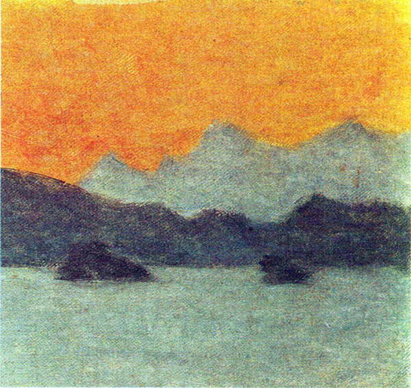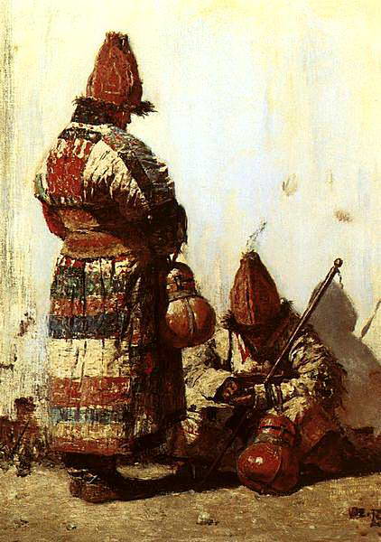 Полотно «У дверей мечети» переносит зрителя в современную художнику эпоху. Оно знакомит с повседневной жизнью Средней Азии. На полотне изображена почитаемая местными мусульманами святыня – мечеть Газрет-Ясави в городе Туркестане. Такие же, как и на предыдущей картине, массивные двери, украшенные сплошным узорчатым орнаментом. По обе стороны от них два нищих дервиша, ищущие насекомых в своих ветхих лохмотьях, контрастируют с великолепием дверного орнамента. Картина напоминает о застое восточной цивилизации; нарядный фасад не может скрыть социальных язв. Фигуры дервишей, в отличие от двух стражей на предыдущем полотне, расположены асимметрично, они жалки, ничтожны. Но есть в этих нищих дервишах и импозантных стражниках и нечто общее. И те и другие – порождение феодального общества, лишившего их творческого, интеллектуального начала и давшего им в удел убогость духовной жизни, преобладание животного начала над всем остальным.