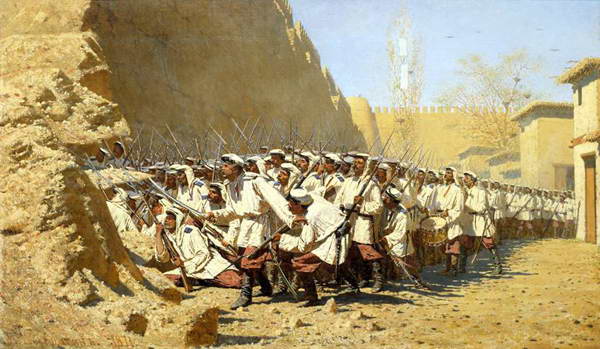 Первая картина из этого цикла – «Высматривают» (1873). Содержание ее таково: небольшая группа бухарских солдат-дозорных притаилась на крутом обрыве и наблюдает из своего укрытия за русским отрядом. Пестрая одежда бухарцев сливается с яркой зеленью. Где-то неподалеку расположились их главные силы, готовые по первому сигналу дозорных напасть на не подозревающих об опасности русских.
