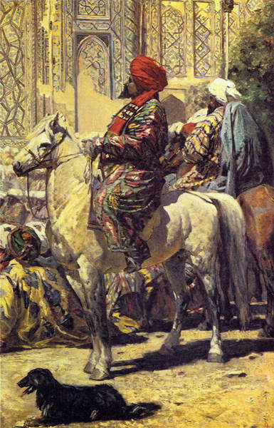 В картине «У гробницы святого благодарят всевышнего» (1873) бухарский эмир со своими приближенными у гробницы Тамерлана в самаркандском мавзолее Гур-Эмир воздает благодарственные молитвы за дарованные победы. Художник, мастерски передав красоту отделки мавзолея, сложную вязь орнамента, словно любуется великолепием архитектурного сооружения, возведенного руками талантливых народных умельцев, а богомольный эмир со своей свитой лишь нарушает гармонию этой красоты.