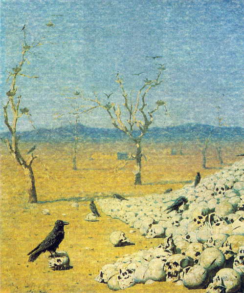 Самая значительная работа в туркестанской серии верещагинских картин – «Апофеоз войны» (1871–1872). Место действия – Туркестан времен Тамерлана, конец XIV – начало XV века. Песчаная пустыня с цепью невысоких гор вдали. Мертвые, высохшие деревья на месте когда-то цветущих садов. На втором плане развалины обезлюдевшего, разгромленного города. Это следы многовековой культуры, созданной руками людей и уничтоженной ордой завоевателей. На переднем плане привлекающая пернатых хищников зловещая пирамида из человеческих черепов с пробоинами от ударов копьем.