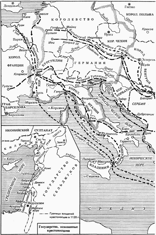 Крестоносцы собирались в Святую землю к Гробу Господню. Послушаем аббата Гвиберта Ножанского: «По закрытии Клермонского собора – а он был созван в ноябре месяце (1095 г.), в восьмой день после праздника святого Мартина, – по всем провинциям Франции разнеслась о нем большая слава, и каждый, кому быстрая молва доставляла папское предписание, шел к своим соседям и сородичам, увещевая (их) вступить на стезю Господню, как называли тогда ожидаемый поход.
