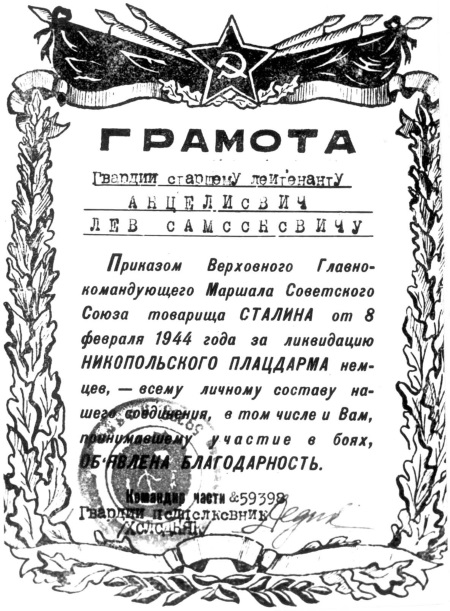 «Анцелиович Л.С. в боях за населенный пункт Березнеговатое с комсомольцами первым ворвался в село, нанося большие потери немцам».