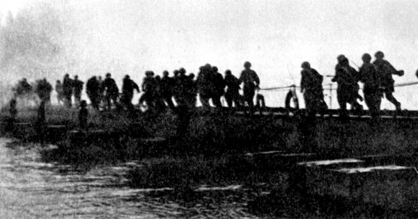 При переправе по понтонному мосту через Днепр второго эшелона наших частей вдруг в небе над рекой появился самолет с крестами на крыльях. Он летел с севера, вниз по течению Днепра. Подлетая к переправе, немецкий летчик сбросил несколько бомб. Одна из них попала в мост и разорвала его. Разорванные части моста понесло по течению вниз, один – к левому берегу, другой – к правому. Тогда погибло несколько наших воинов, одна пушка ушла под воду. Но вскоре появились два катера. Они отбуксировали разорванные концы моста на середину реки, саперы их там соединили, и переправа продолжалась.