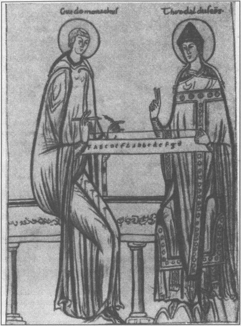 На миниатюре XII в. у монохорда бенедиктинский монах Гвидо из Ареццо объясняет интервалы епископу Теобальду. Гвидо ввел также нотный стан и названия ступеней гаммы – ут (позже до), ре, ми, фа, соль…