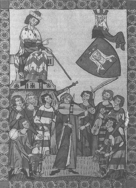 Генрих Фрауэнлоб из Мейсена (XIII век) на состязании миннезингеров играет на фиделе (виоле) в присутствии одного из германских государей. Прижизненная миниатюра. На щите – изображение Богоматери