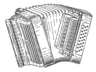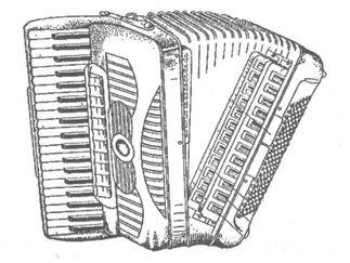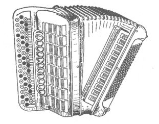 Аккордеон: под правой рукой – клавиатура как у рояля, выше – переключатели регистров, под левой рукой кнопки для аккордов аккомпанемента, как у баяна