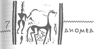 Во Фракии Диомед почитался как сын Ареса, обладавший хищными конями, которых он кормил человеческим мясом (опять человеческие жертвы). Этих кобылиц он привел в Арголиду, где его убил Геракл, а коней, отданных Гераклом Эврисфею, тот принес в дар Гере (Диодор, VI, 5). Мотив коней при Диомеде напоминает не только об известном Фракийском Всаднике. В «Илиаде» очень заметно пристрастие Диомеда к коням. Он отбирает чудесных Троевых коней у Энея, угоняет белых коней фракийского царя Реза, захватывает коней у ряда других противников, в состязаниях он побеждает на колеснице. Видимо, в Арголиде, в «питающем коней Аргосе» («гиппоботон» – постоянный эпитет Аргоса в «Илиаде»), существовал издавна культ героя-всадника, близкого к Афине – в городе Аргосе и к Гере – в Тиринфе. Первый – Диомед, второй – Геракл. (Кстати, при раскопках аргивского Герея в ранних слоях обнаружено много глиняных статуэток всадника, а в Олимпии найдена статуэтка VIII века из Аргоса: человек с копьем, стоящий на коне.)