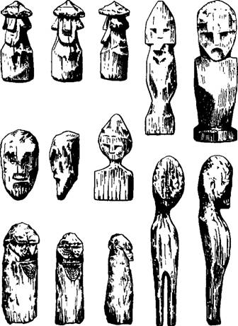 Рис. 24. Кутные божки – деревянные резные фигурки из Новгорода (раскопки Арциховского). По книге Рыбакова (1987, рис. 83)