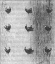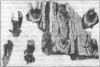 Рис. 27. Челюсти вепря, вбитые в дуб, находки на Днепре. Фрагмент дуба с кабаньими челюстями. По Ивакину 1979, рис. 1