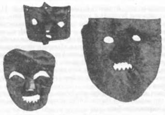 Рис. 41. Святочные маски ряженых – находки из раскопок Новгорода. По книге Рыбакова (1987, рис. 117а)