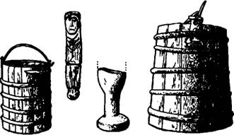 Рис. 43. Свадебный набор XII в. из Ленчицы (Польша): бадейки и деревянная фигурка фаллоса. (По книге Рыбакова 1981/1997: 49, рис.)