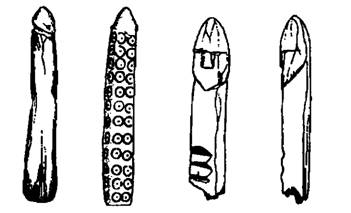 Рис. 44. Деревянные фаллические фигурки древних славян: находки из Старой Русы (слой XI в., раскопки А. Ф. Медведева), Волина (Польша), Стрмена (Болгария)