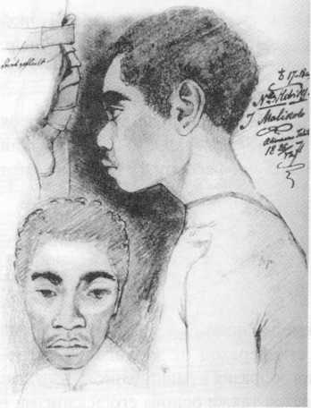 «Одна из них кинулась мне в глаза своей курчавой головою, ей было лет двенадцать. Когда с веслом в руках, в саронге, который узко обхватывал среднюю часть туловища, она шла по стволу срубленного дерева, она показалась мне очень грациозным созданием. Я пожелал нарисовать ее портрет, тем более, что ее вьющиеся волосы делали из ее физиономии особенный тип. Но она стыдилась, боялась, одним словом не хотела прийти к занимаемой мною хижине. Это происходит, как мне кажется, оттого, что мужчины обращают внимание (в половом отношении) на очень молодых девочек, так что, если посмотреть немного пристальнее на 11–10-летнюю девочку, она стыдится, убегает, как бы боится, что ее хотят изнасиловать, или же сама заигрывает» (ММ 2: 23).