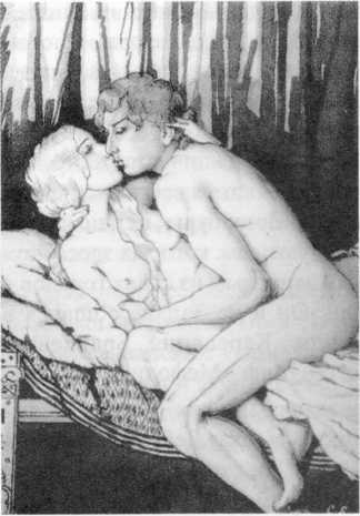 Сразу же после выставки, организованной Лукьяновым, и переезда в Париж у Константина Андреевича появился новый юноша-натурщик, конечно, из русских – Борис Снежковский. Он был привлечен для создания серии рисунков к повести древнегреческого автора Лонга «Дафнис и Хлоя» – о неопытных влюбленных. Пастух и пастушка, Дафнис и Хлоя, были воспитаны в неведении и совершенно не представляли себе, для чего у людей детородные органы и как они действуют в любви. Влюбившись друг в друга и терзаемы любовным томлением, они обмени вались нежными и страстными ласками, но не знали, как утолить свою страсть, пока, после их долгих мук и метаний, опытная женщина не обучила Дафниса. Для издания этой эротической повести Сомову были заказаны иллюстрации, и он искал натуру.