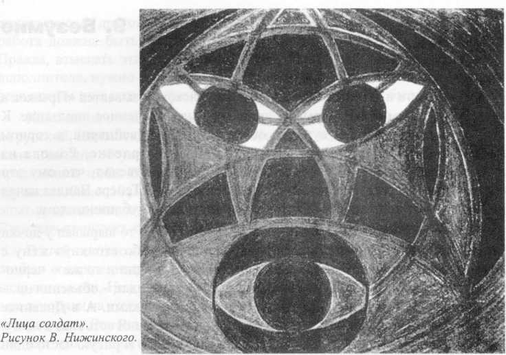 При этом он стал совершать странные поступки – то вырывал у дочки тарелку с бифштексом (чтобы не ела мяса), то грубо столкнул жену с лестницы. То начинал быстро-быстро рисовать все одно и то же – черно красные личины с пронзительными глазами. «Лица солдат, – объяснил он. – Это война». Вся комната была завалена этими рисунками. А в Дневнике другое объяснение: «Глаз есть театр. Мозг есть публика. Я есть глаз в мозгу. Я люблю смотреть в зеркало и видеть один глаз на лбу. Я рисую часто один глаз. Я не люблю глаз в красной с черными полосами шапке…. Я есть глаз Божий, а не воинственный» (Чувство 2000: 90). Однажды, войдя на кухню, Ромола застала слуг – горничную, кухарку, истопника и прачку – молчаливыми и печальными. «Что случилось?» – спросила она. Молодой истопник объяснил, что до Нижинских в деревне жил господин Ницше, и когда он сошел с ума, то вел себя точно так же, как господин Нижинский сейчас. Он ходит по деревне с большим золотым крестом на шее и уговаривает людей идти в церковь. Ромола побежала и вернула мужа.