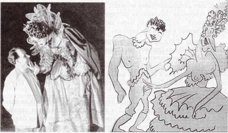 И даже когда сам Малюта Скуратов, глава опричников, подползает к царю в келье, царь его спрашивает: «Ну что, соскучился по царской ласке?» и поскребывает ему бороду (античный жест сексуальной ласки), а тот довольно покряхтывает. Если эротичность этой сцены кому-либо недостаточно ясна (ее не разглядели цензоры – пропустили), дополнительный штрих вносится собственноручным озорным рисунком Эйзенштейна «Малютин костюм»: у Малюты из-под распахнутых пол кафтана вздымается выше головы громаднейший толстенный половой член, красный и увенчанный головой дракона (Ковалов 1998).