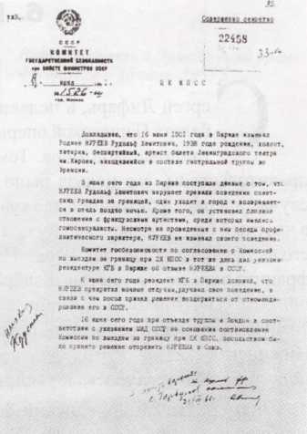 3 июня сего года из Парижа поступили данные о том, что НУРЕЕВ Рудольф Хамитович нарушает правила поведения советских граждан за границей, один уходит в город и возвращается в отель поздно ночью. Кроме того, он установил близкие отношения с французскими артистами, среди которых имелись гомосексуалисты. Несмотря на проведенные с ним беседы профилактического характера, НУРЕЕВ не изменил своего поведения.