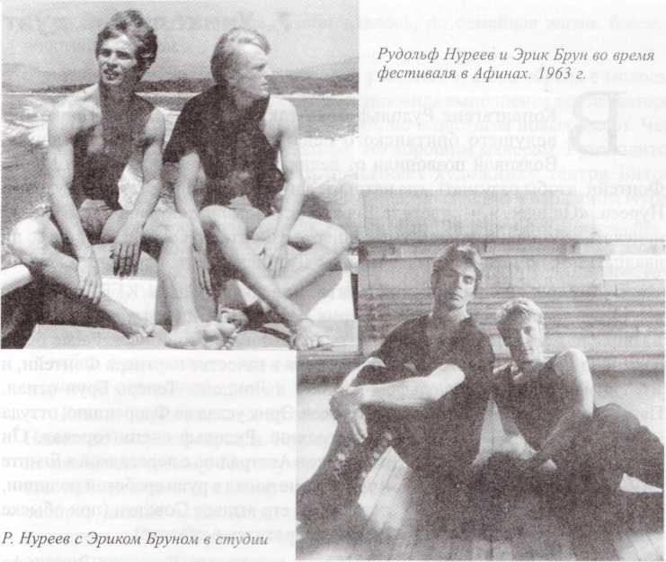 Эрику было 32 года, и он слыл наиболее совершенным из танцовщиков. Чрезвычайно требовательный к себе, он был воплощением стиля и благородства в танце. «Я поприветствовал Мэри, – вспоминал Эрик, – и тут же сидел этот молодой танцовщик, небрежно одетый в джинсы или слаксы. Я сел, посмотрел на него повнимательнее и увидел, что он весьма привлекателен. У него был определенный стиль… некий класс. Это нельзя назвать естественной элегантностью, но это каким-то образом производило впечатление». В Бруне Рудольф увидел свой идеал. Высокий блондин, элегантный, длинноногий, с отточенной техникой, он танцевал необыкновенно чисто и поэтично. Он тоже вырос в семье без отца, с матерью и тремя сестрами – как нарочно, точно как у Нуреевых. Подобно Рудольфу, он больше тянулся к мужчинам. Они по уши влюбились друг в друга и выразили желание остаться одни. Толчиф закатила истерику, но ей пришлось уехать. Рудольф непрерывно учился у Бруна, старательно копируя его исполнение. Постепенно Брун начал ревновать Рудольфа к публике. Он никогда не имел у нее такого приема, несмотря на все совершенство своей техники. Его изумляла истерическая слава Нуреева.