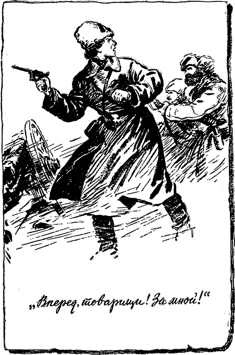 Только нельзя так долго из пушек стрелять. Это тебе не пулеметы. Разобрались белые, что нас меньше, чем их, и давай обходить наш отряд с двух сторон. Тут и их орудия заговорили. Затрещали винтовки. Справа, слева, сзади разворотило снег взрывами. Один боец упал, застонал другой. С меня пулей шапку сорвало. Затоптались наши на месте. И тут снова увидел я Ольгу Русакову. Она появилась внезапно из метели, вся облепленная снегом, в своей туго перепоясанной шинели, с маузером в руке: „Вперед, товарищи! За мной! Нам на помощь идут кавалеристы!“