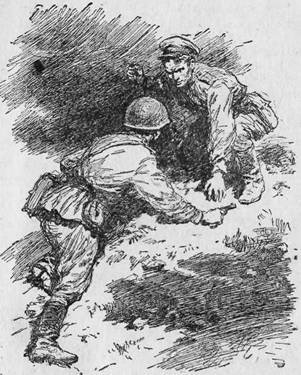 Сержант выскочил из укрытия и кинулся на врага, торопливо убегавшего к низине. Над позициями противника стали вспыхивать ракеты. Всё вокруг то озарялось бледным мертвенным светом, то погружалось в ещё более плотную тьму. Прошить убийцу автоматной очередью ничего не стоило, но не этого хотел Костылёв. Сержант несколькими скачками настиг убийцу и внезапно ударил его автоматом в спину. От неожиданности человек неуклюже взмахнул руками и, выронив пистолет, упал. Не удержался на ногах и сержант.