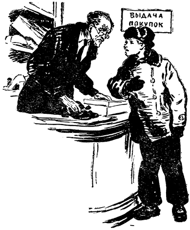 В магазине, как всегда, было полно покупателей. Гремела музыка. Иногда она умолкала, и громкий голос объявлял: «Граждане покупатели, в нашем магазине вы можете приобрести новые пальто, костюмы, посуду, изделия из хрусталя и фарфора…»
